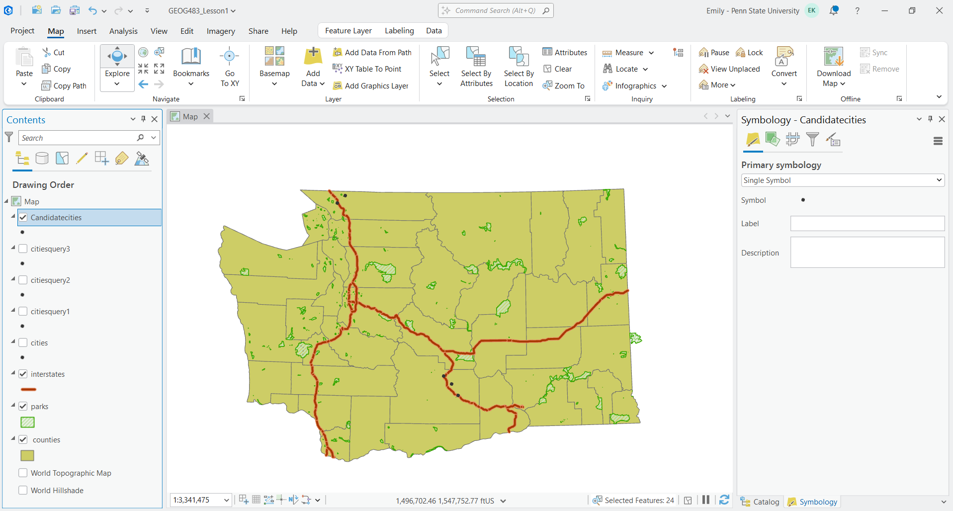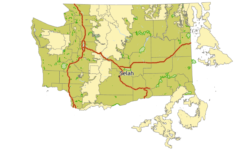Figure 3 - This is a screenshot of my final result of the Washington State map. It shows the counties, interstates, parks, and assorted layers generated from analysis, but also includes the labeled final candidate city of Selah. It was generated in ArcGIS Pro on March 4, 2026, by Emily Kauffman as part of the Lesson 1 site-selection project.