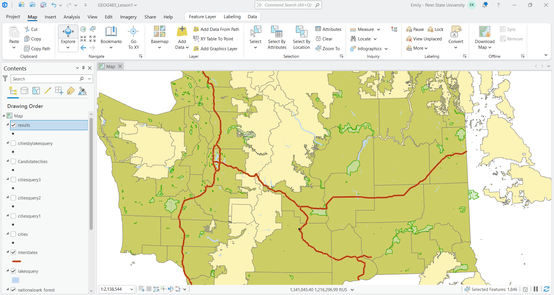 Figure 2 - This screenshot includes a map of Washington, interstates, parks, and outlined counties, as well as the one remaining candidate city for Jen and Barry’s new ice cream shop, after filtering by cities that are close to a National Park Unit or US Forest, and within 10 miles of a lake. The light yellow shows the newly added National Park layer, although the data does spill over the edges of the counties layer. It was generated in ArcGIS Pro on March 1, 2026, by Emily Kauffman as part of the Lesson 1 site-selection project.